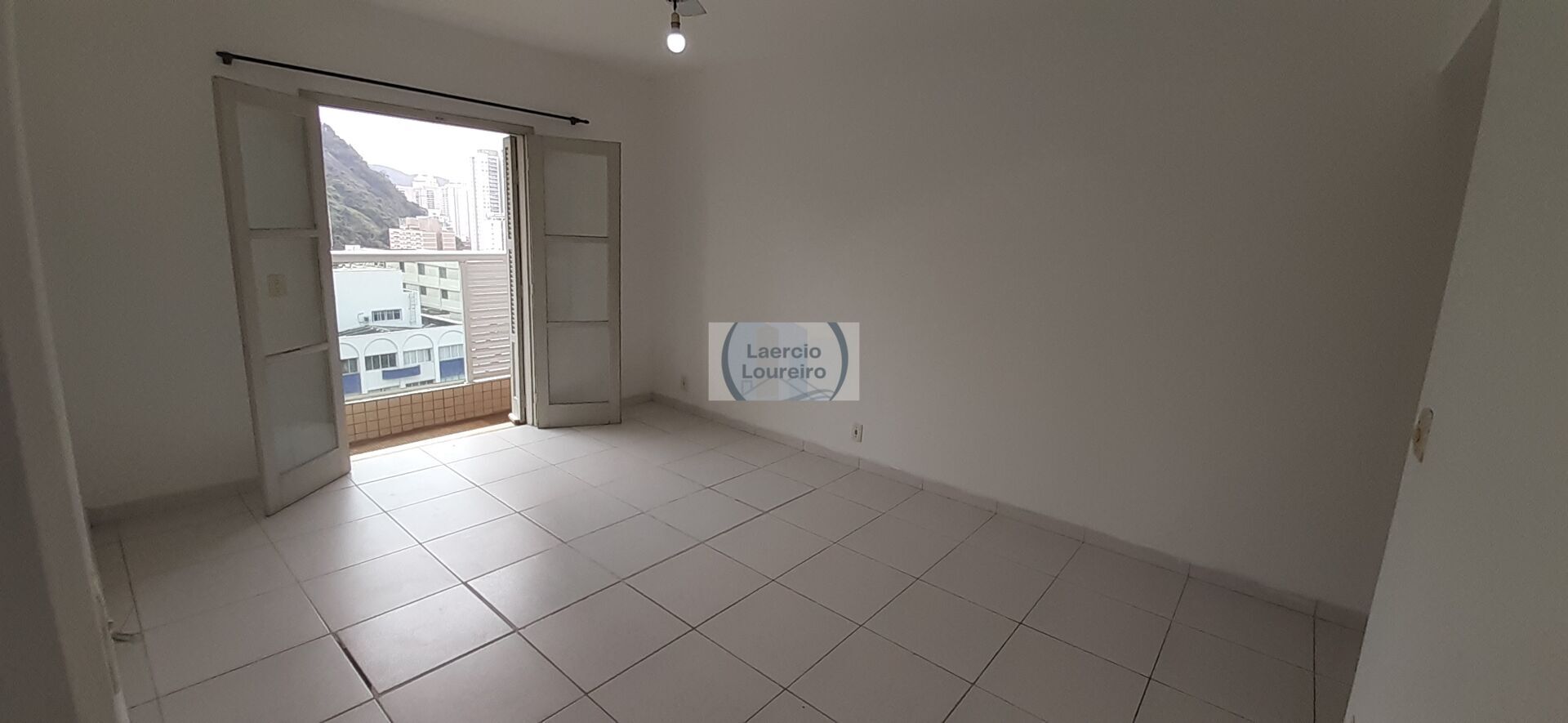 Sala ampla com varanda e vista para a rua.